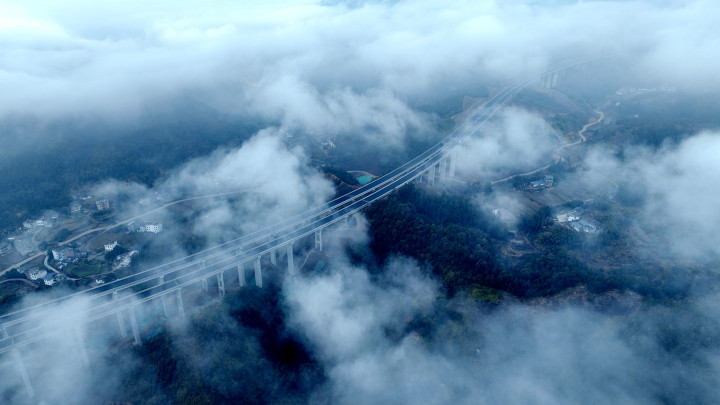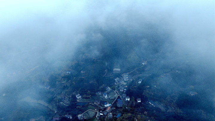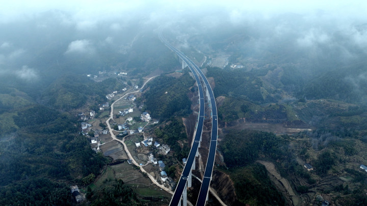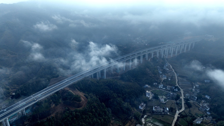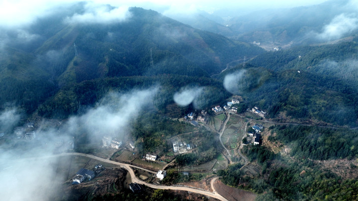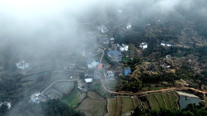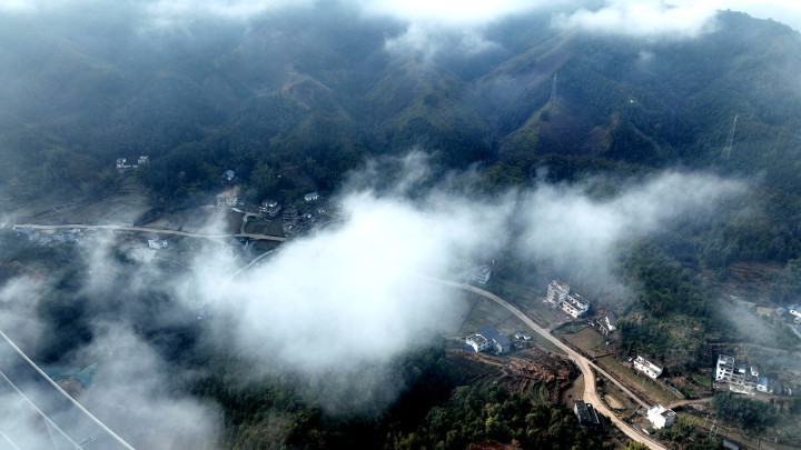 近日,江西省遂川县左安镇山区一带烟雨蒙蒙,村庄、青山、公路隐现于云雾缭绕的田园间,勾勒出一幅诗意盎然的春日水墨画。